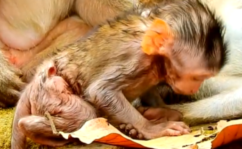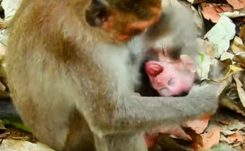 A fragile newborn monkey struggles with every small movement, its tiny body trembling as it tries to take its first tentative steps. Each wobble and stagger highlights the delicate balance …