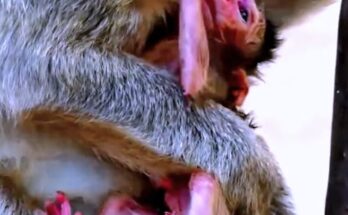 Weak baby monkey trembles softly, his tiny body struggling against a world far too harsh for his fragile strength. His single swollen eye, barely able to open, glistens with quiet …