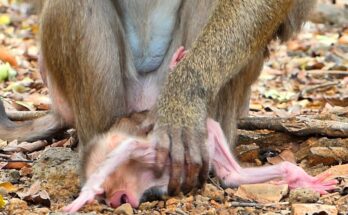 In a touching scene from the wild, a premature baby monkey experiences her first comforting touch as her mother gently cradles her tiny body. The little one trembles softly, seeking warmth and security, while the mother’s careful hold radiates patience and love. Her delicate fur brushes against the baby’s fragile skin, offering reassurance and protection in a moment filled with tenderness. This quiet, intimate interaction highlights the profound bond between mother and child, showing that even in the harshness of nature, care and affection can create a safe haven. A truly heartwarming glimpse into wildlife nurturing.
