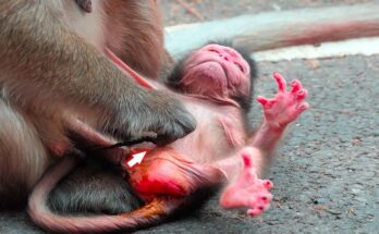 In a tense yet captivating moment in the wild, baby monkey nearly slips from his mother Stephanie’s arms, capturing the raw unpredictability of nature. While Stephanie attempts to lift her little one with care, her brief distraction causes a heart-stopping wobble, leaving the tiny monkey clinging tightly. Observing this delicate scene, one can’t help but admire Stephanie’s maternal instincts as she quickly regains focus, ensuring her baby’s safety. This incident highlights both the vulnerability of newborn monkeys and the extraordinary patience and attentiveness required from mothers in the wild. Nature’s balance between risk and care is powerfully evident here.