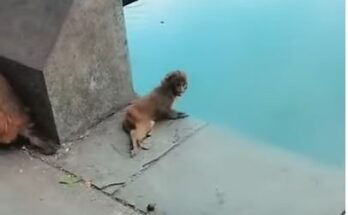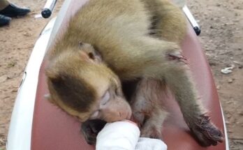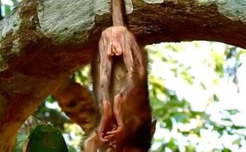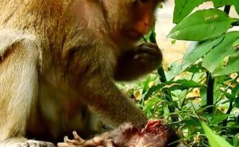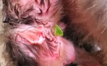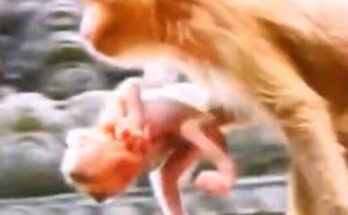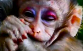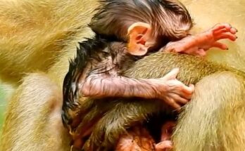 In the quiet corner of the forest, a heartbreaking scene unfolds. A tiny baby monkey clings tightly to his mother’s chest, his fragile hands trembling with desperation. His cries echo …