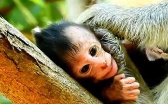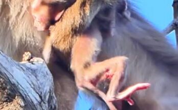 In the quiet heart of the forest, a tender mother monkey sits beneath the shade of an old tree, her fragile baby resting weakly in her arms. The little one …