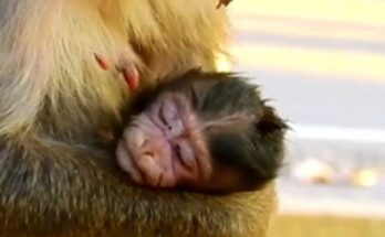 Helpless mother monkey watches her weak newborn tremble, heart breaking in silence. Read More