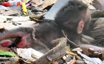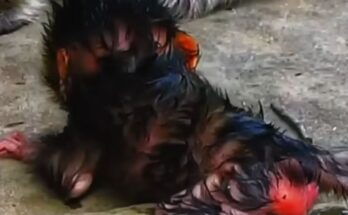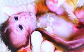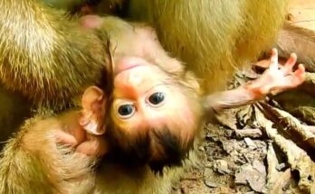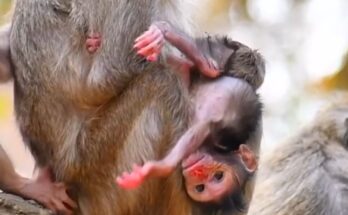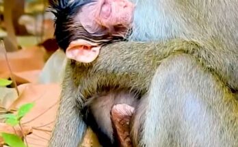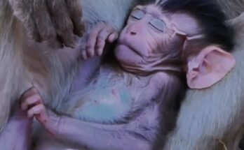 The weak baby monkey gazes up at his mother, his tiny eyes filled with longing and confusion. His frail body trembles with exhaustion, each breath shallow and uneven. He stretches …