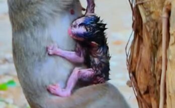 Moments after entering the world, the tiny baby monkey lets out a soft, trembling cry. His fragile body, still wet from birth, shivers as he searches for the warmth and …