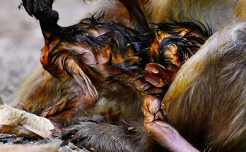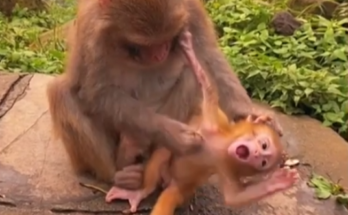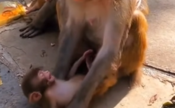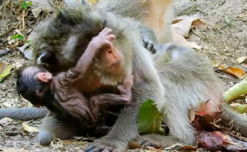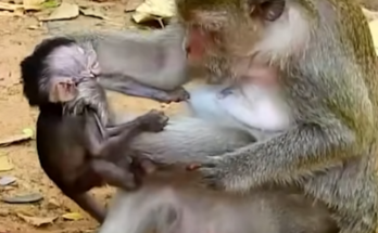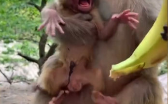 This heartbreaking scene captures a desperate moment in the wild as a tiny baby monkey cries loudly, begging for milk from its own mother. Weak and hungry, the newborn clings …