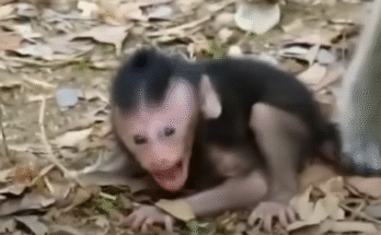 In the heart of the forest, a devastating scene unfolds: a newborn monkey, barely days old, lies on the ground, crying out in confusion and pain. Its tiny leg is …