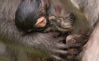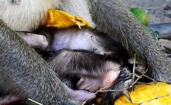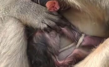 Hungry newborn monkey cries softly, his fragile body yearning for mother’s warm milk. His tiny chest rises and falls with shallow breaths, each sound a plea for comfort. His eyes, …